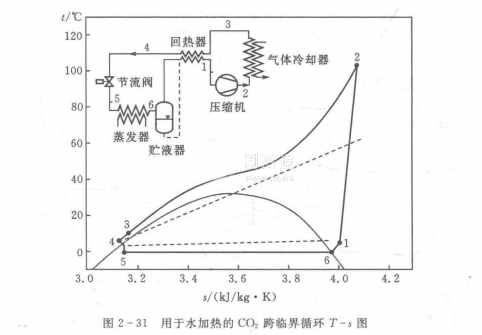 核心提示:利用CO2跨臨界循環(huán)加熱水的熱泵裝置的原理性系統(tǒng)與循環(huán)如圖2一31所示。圖上方示出的系統(tǒng)組成與圖2一30(b)類似。T一s圖中的虛線