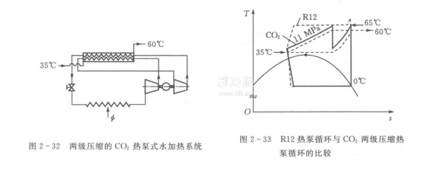 當(dāng)要求加熱水溫升較小時(shí),上述系統(tǒng)的CO2:的排熱溫度曲線與被加熱流體的吸熱溫度曲線匹配不理想,存在COPH:下降的問題。用分級壓縮可以解決該問題。通過分級壓縮,讓CO2的排熱溫度曲線與期望的形狀相接近。圖2-32示出一個(gè)兩級壓縮的CO2熱泵式水加熱系統(tǒng)。將水的溫度從35℃加熱到60℃,適用于溫帶地區(qū)冬季供暖裝置。圖2-33利用T-s圖給出在同樣制熱能力和加熱溫度要求下,傳統(tǒng)R12熱泵循環(huán)與CO2兩級壓縮熱泵循環(huán)的比較。顯然,由于熱交換的溫度匹配關(guān)系改善了,CO2系統(tǒng)的能效明顯優(yōu)于傳統(tǒng)系統(tǒng)。